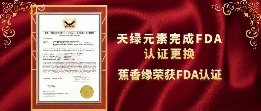 天缘绿集团旗下两款拳头产品--天绿元素完成了每年一次的FDA认证更新,蕉香缘果味饮品通过层层严格检测,最终荣获FDA认证。目前,集团已有两款产品获得了被世界卫生组织认定为最高食品安全标准的FDA认证。