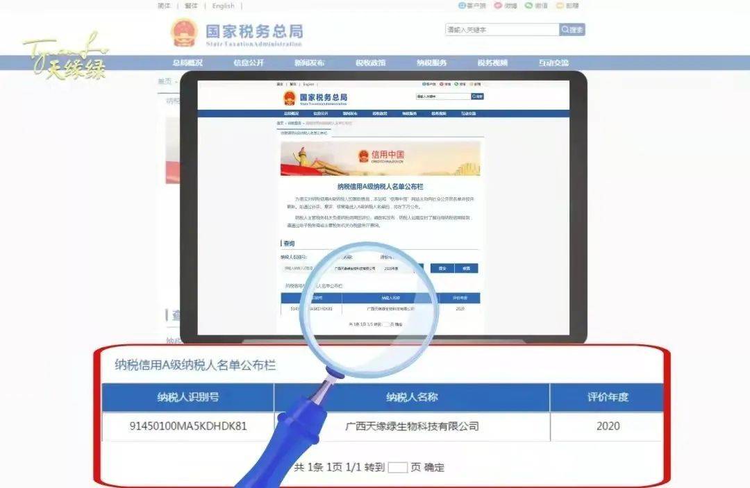 国家税务总局广西壮族自治区税务局公布了《2020年度纳税信用A级纳税人名单》,天缘绿集团母公司“江南全站”获评为2020年度“纳税信用A级纳税人”。