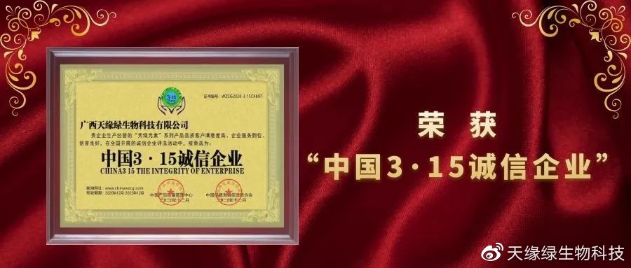 天缘绿集团母公司--江南全站因经营的“天绿元素”系列产品品质客户满意度高、企业服务到位、信誉良好,在全国开展的诚信企业评选中,被荣选为“中国3·15诚信企业”。
