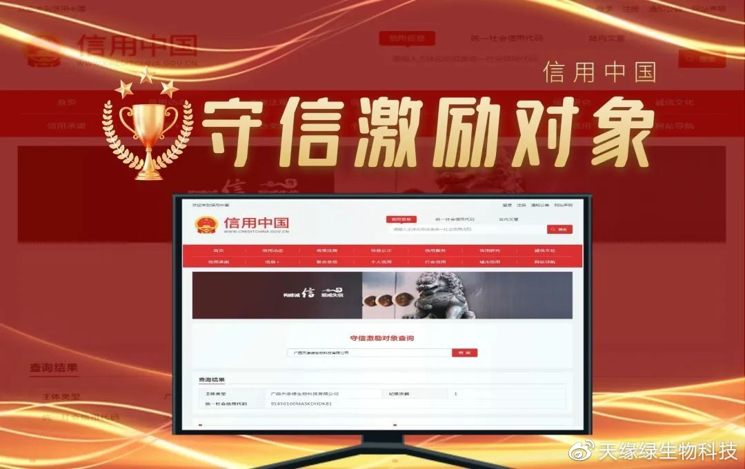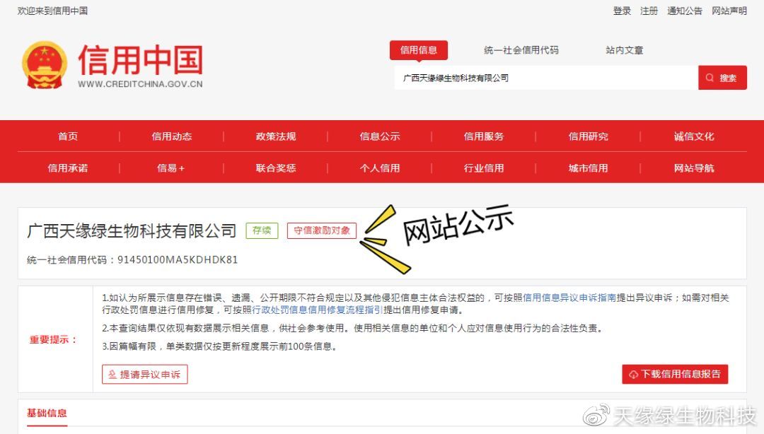 天缘绿集团母公司获信用中国网站“守信激励对象”公示