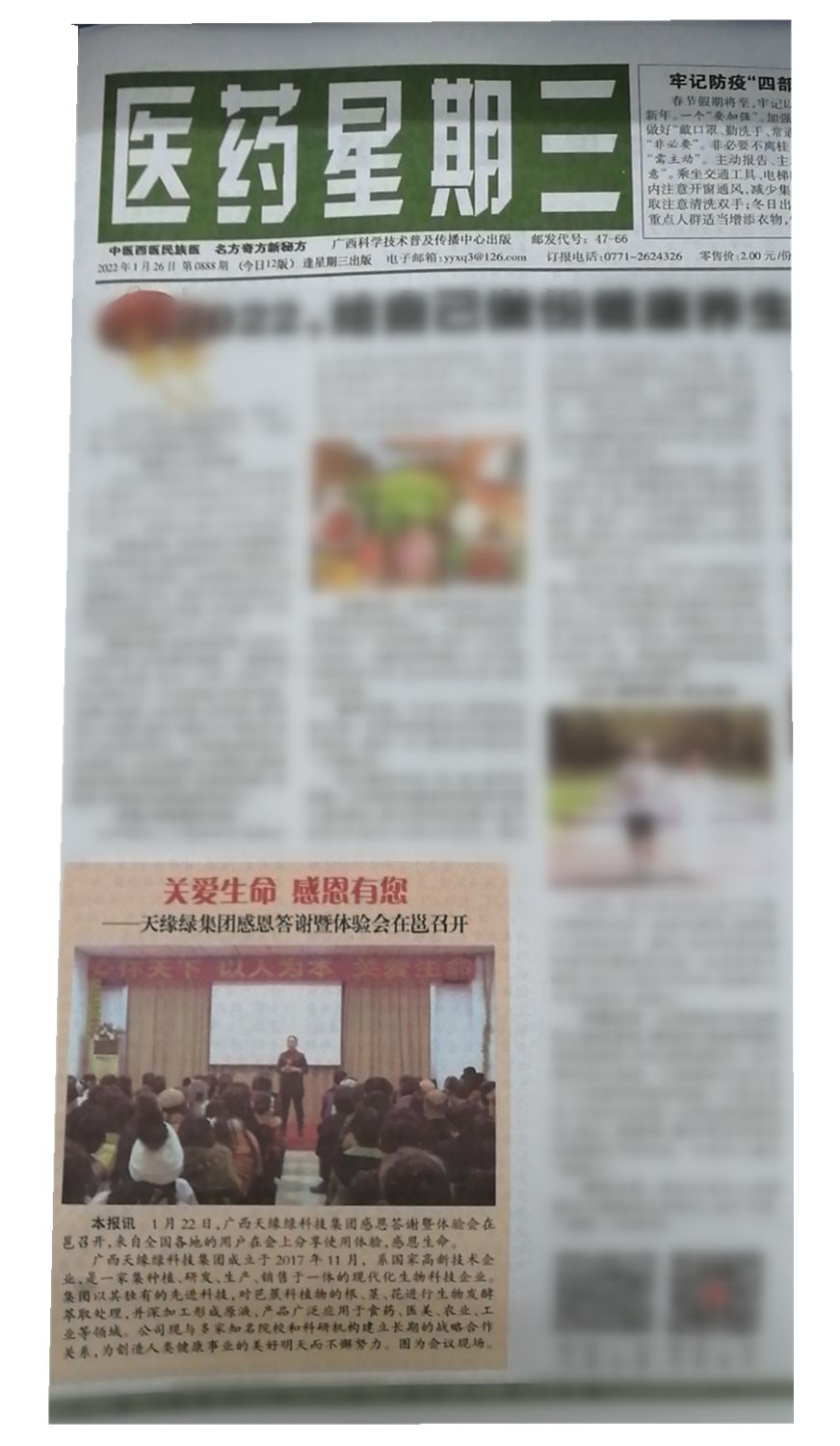 由广西科学技术普及传播中心出版的《医药星期三》1月26日第0888期进行了以“关爱生命 感恩有您--天缘绿集团感恩答谢暨体验会在邕召开”为主题的活动专题报道。