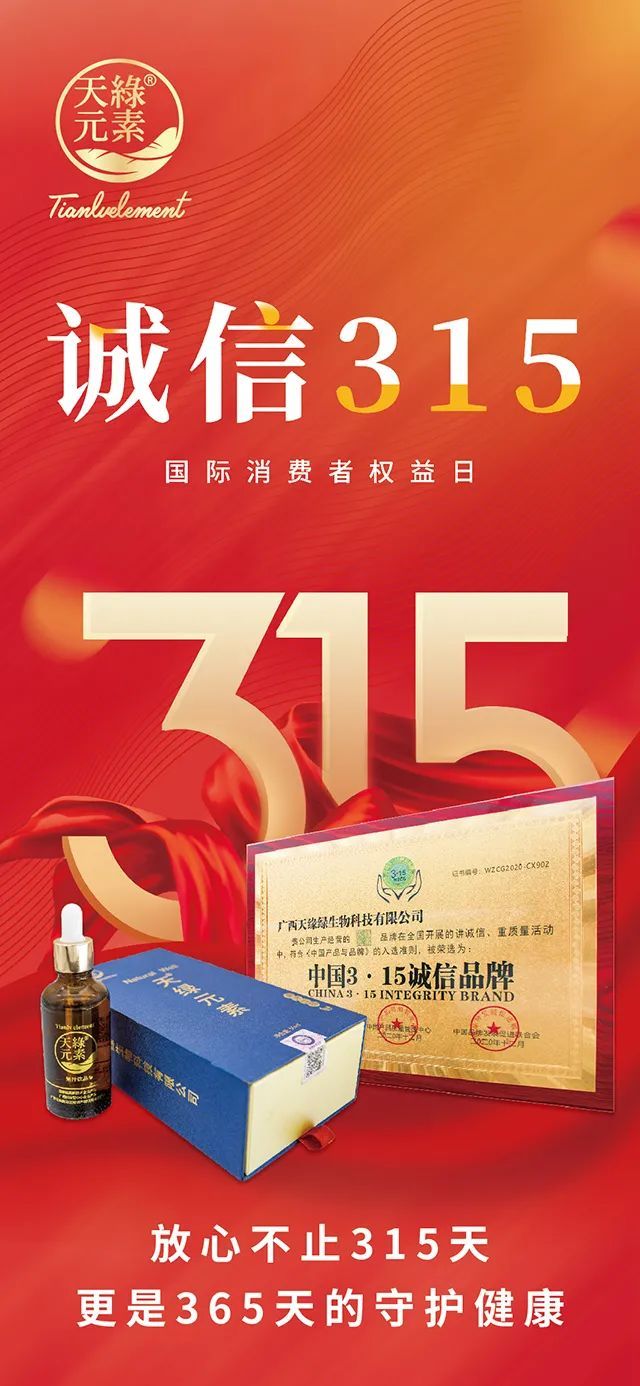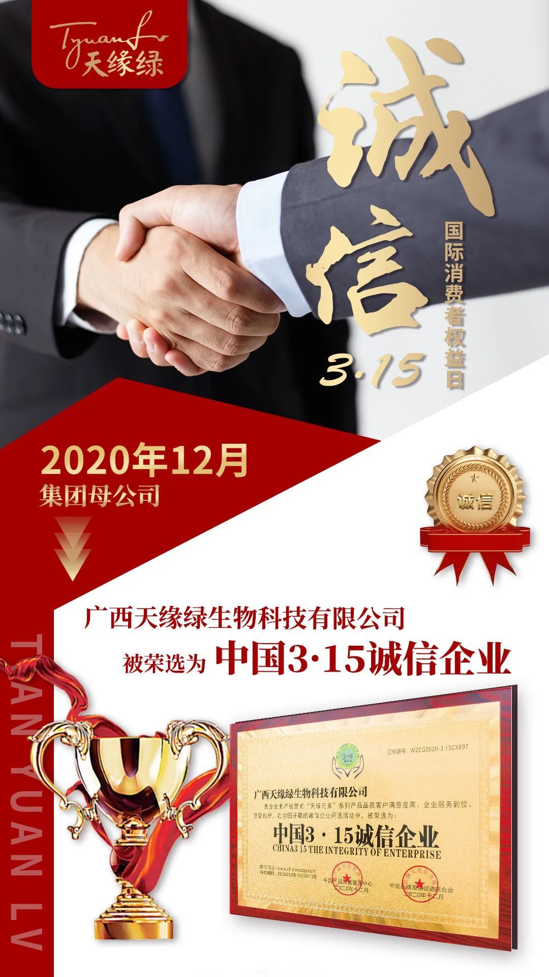 2020年12月,天缘绿集团母公司--江南全站因经营的“天绿元素”系列产品品质客户满意度高、企业服务到位、信誉良好,在全国开展的诚信企业评选中,被荣选为“中国3·15诚信企业”。同时,“天绿元素”品牌也凭借品质和实力,经过重重筛选和检测后,在全国开展的讲诚信、重质量活动中,符合《中国产品与品牌》的入选准则,被荣选为“中国3·15诚信品牌”。