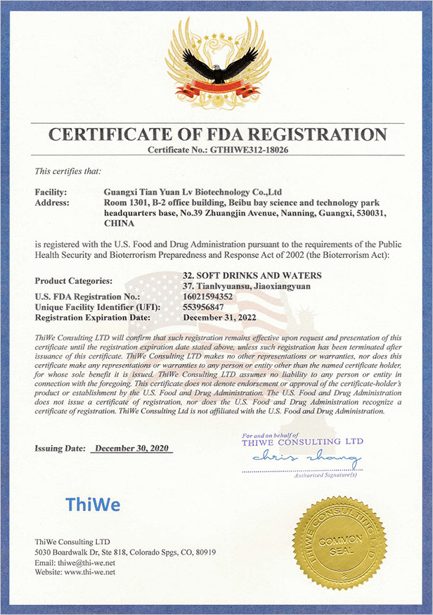 2020年12月30日,天缘绿集团旗下两款拳头产品--天绿元素完成了每年一次的FDA认证更新,蕉香缘果味饮品通过层层严格检测,最终荣获FDA认证。目前,集团已有两款产品获得了被世界卫生组织认定为最高食品安全标准的FDA认证。
