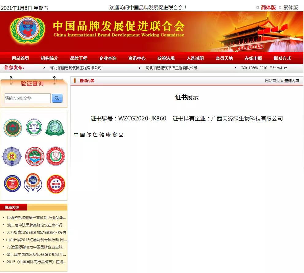 2020年12月公司研发生产经营的“天绿元素”系列产品以优质的选材、过硬的品质,赢得了广大用户的认可,在全国绿色健康食品调研入选活动中,经过严格审核,符合入选标准,被荣选为:中国绿色健康食品(证书编号:WZCG2020-JK860),并获得由中国产品质量管理中心、中国品牌发展促进联合会颁发的荣誉证书。