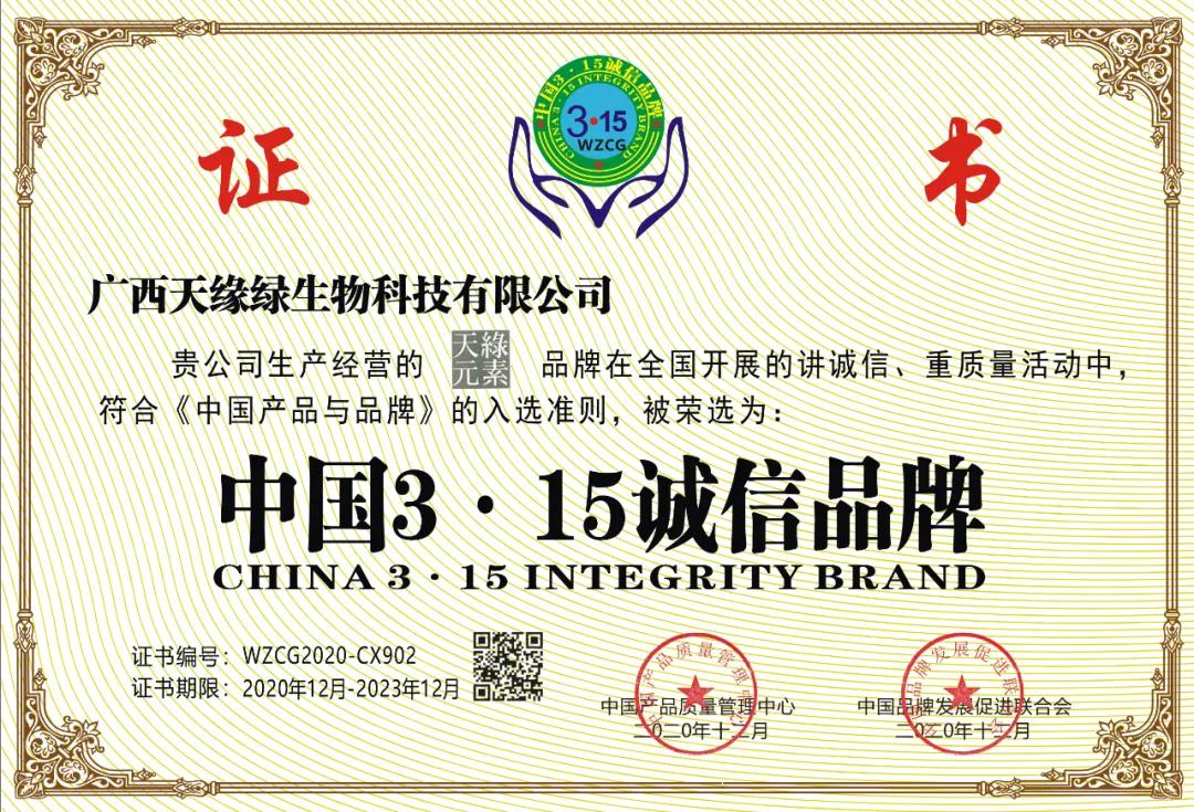 2020年12月,“天绿元素”品牌凭借品质和实力,经过重重筛选和检测后,在全国开展的讲诚信、重质量活动中,符合《中国产品与品牌》的入选准则,被荣选为“中国3·15诚信品牌”(证书编号:WZCG2020-CX902),该证由中国产品质量管理中心和中国品牌发展促进联合会颁发。