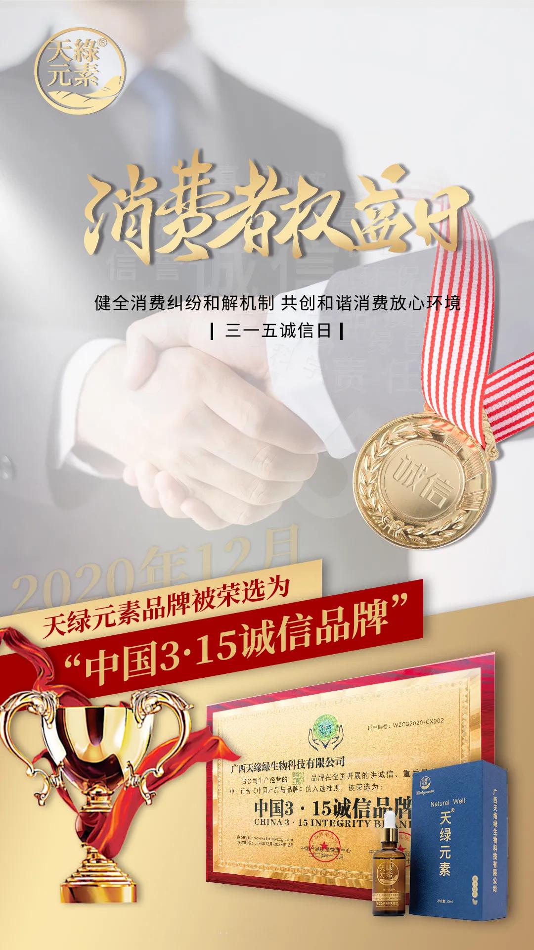 2020年12月,天缘绿集团母公司--江南全站因经营的“天绿元素”系列产品品质客户满意度高、企业服务到位、信誉良好,在全国开展的诚信企业评选中,被荣选为“中国3·15诚信企业”。同时,“天绿元素”品牌也凭借品质和实力,经过重重筛选和检测后,在全国开展的讲诚信、重质量活动中,符合《中国产品与品牌》的入选准则,被荣选为“中国3·15诚信品牌”。