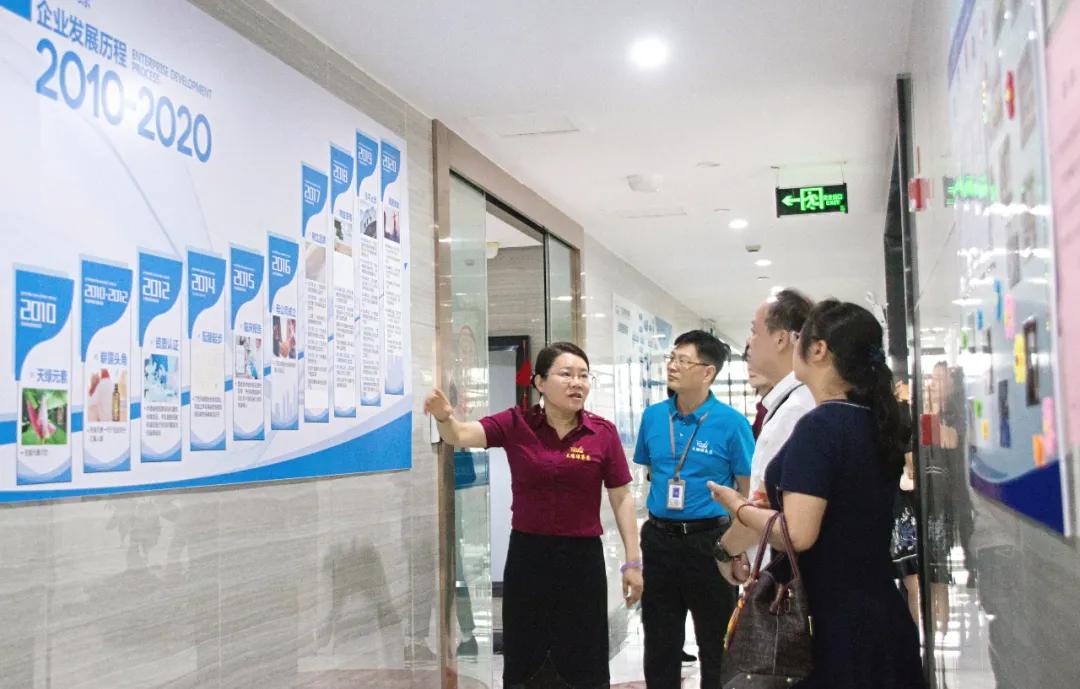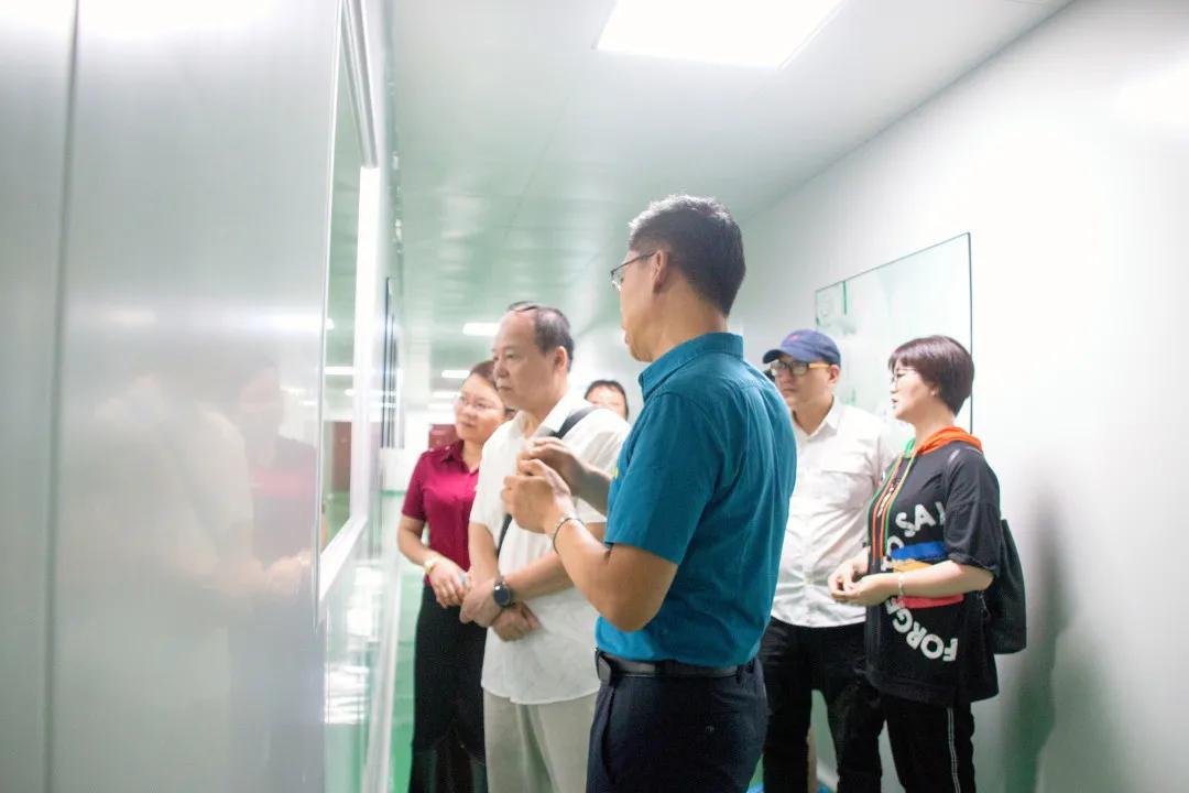 在举行授牌仪式后,陈会长一行在郭总的带领下,在集团行政办公区、天绿元素体验中心和九绿无尘生产车间参观调研,进一步了解集团的企业文化、办公氛围环境、现阶段发展和生产情况。