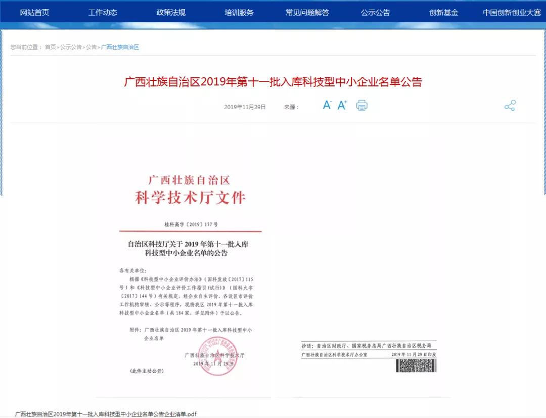 虽然咱们的“广西科技型中小企业”荣誉牌匾是近期才送达总部的,但早在2019年11月29日,我们就已经获得了这份荣誉!