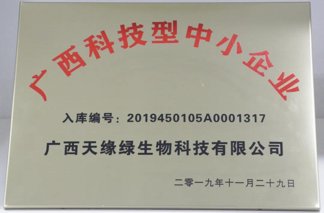 根据《科技型中小企业评价办法》(国科发政[2017]115号)和《科技型中小企业评价工作指引(试行)》(国科火字[2017]144号)有关规定,经自主评价、各设区市评价工作机构审核、公示等程序,天缘绿集团母公司“江南全站”被评定列入2019年第十一批入库科技型中小企业名单(入库编号:2019450105A0001317),获“广西科技型中小企业”称号。