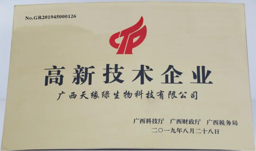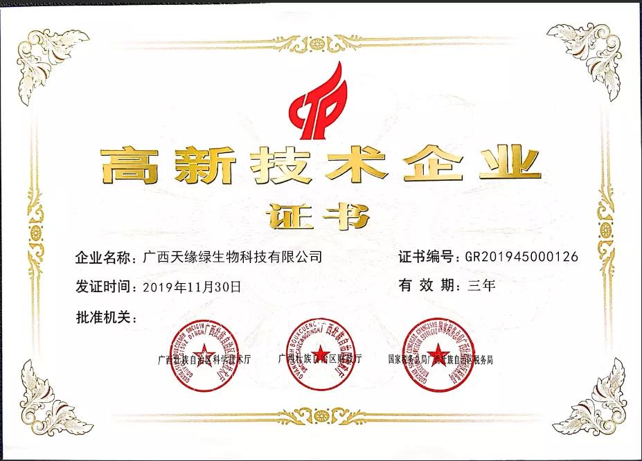 经过广西高新技术企业认定工作领导小组办公室组织专家评审、广西高新技术企业认定工作领导小组成员单位合议、全国高新技术企业认定管理工作领导小组办公室公示,天缘绿集团母公司—天缘绿生物科技有限公司正式荣获“国家高新技术企业”认定,这是公司转型升级致力打造科技型企业取得的又一项重大里程碑。