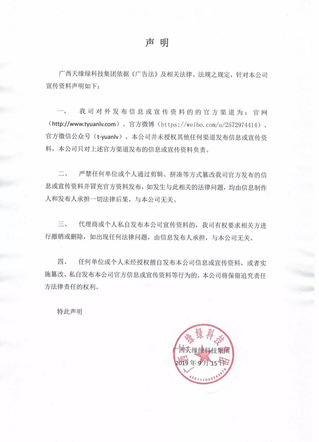 广西天缘绿科技集团依据《广告法》及相关法律、法规之规定,针对本公司宣传资料声明如下: