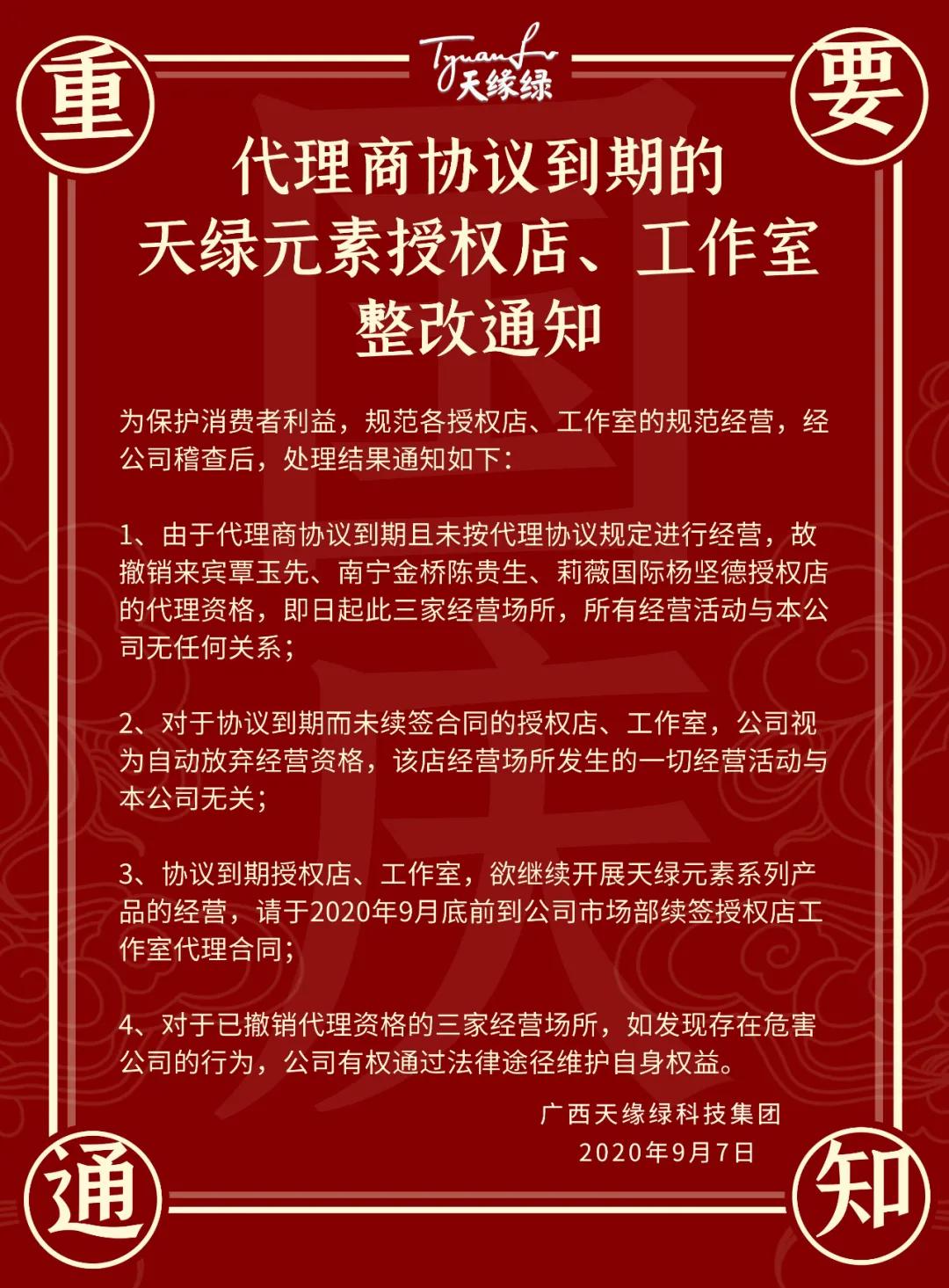 代理商协议到期的天绿元素授权店、工作室整改通知