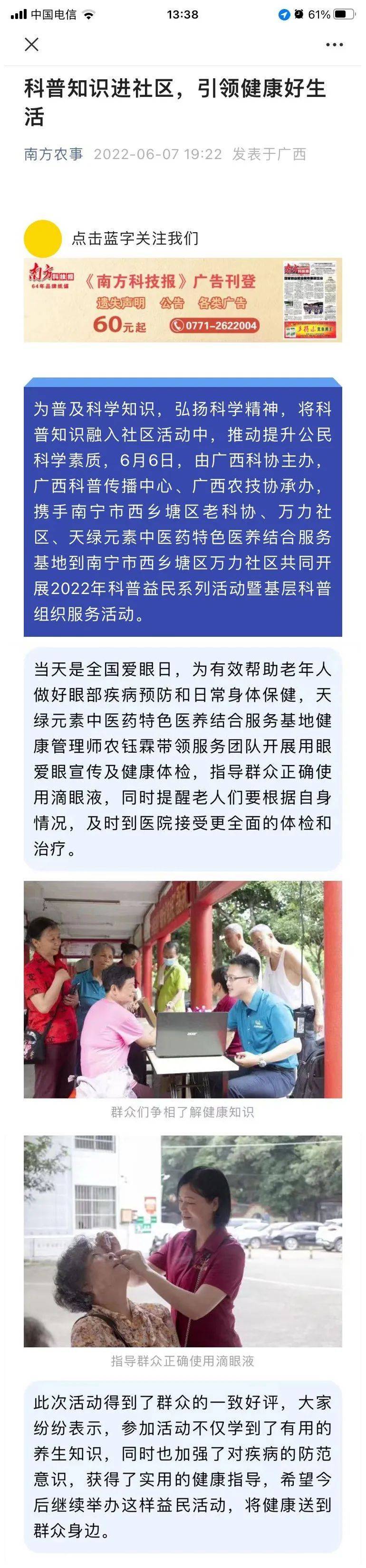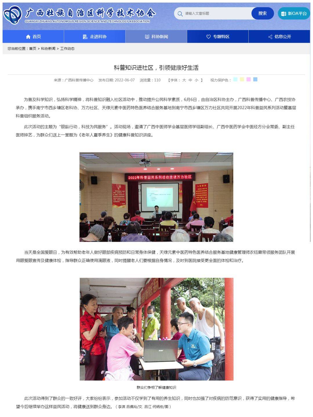 为进一步提高老年人健康养生意识,将健康科普知识融入社区活动中,6月6日,由广西科协主办,广西科普传播中心、广西天缘绿科技集团、广西农技协承办,携手西乡塘区老科协、南宁市万力社区共同开展2022年科普益民系列活动暨基层科普组织服务活动。