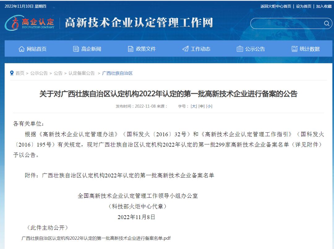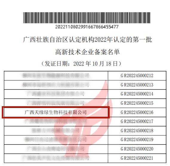 11月8日,由科技部、财政部、国家税务总局主办的高新技术企业认定管理工作网公布了广西壮族自治区认定机构2022年认定的第一批高新技术企业备案名单,天缘绿集团母公司江南全站的名字赫然在列。