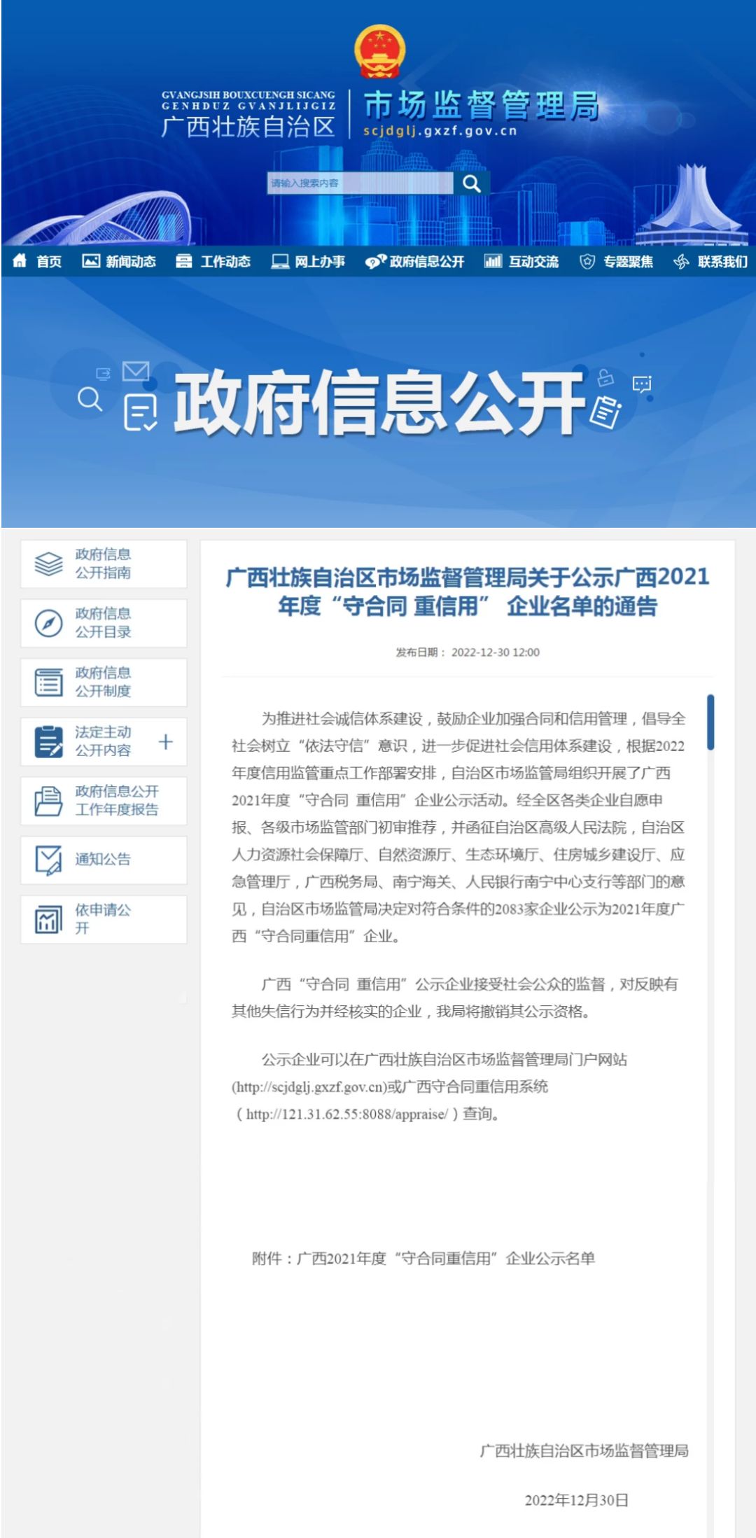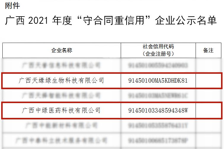 近日,广西市场监管局发布了广西2021年度“守合同 重信用”企业名单,天缘绿集团母公司“江南全站”和子公司“广西中绿医药科技有限公司”凭借良好的市场信誉和规范的合同管理系统,顺利通过评审,获评“守合同 重信用”企业!