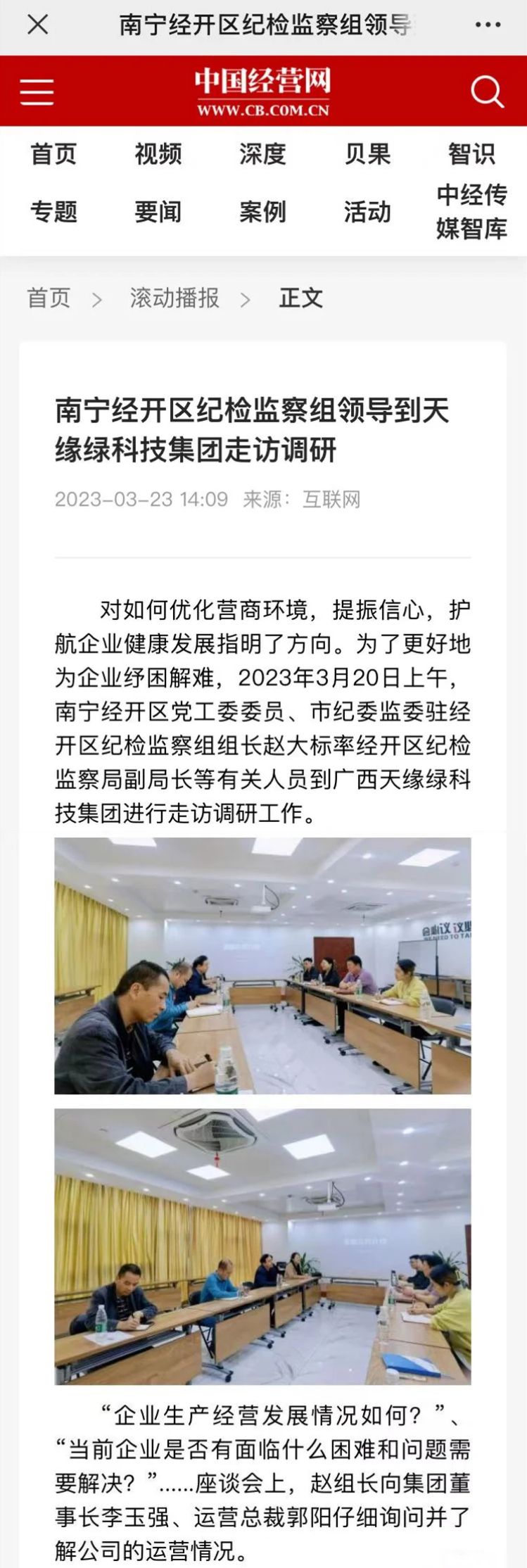 2023年3月20日上午,南宁经开区党工委委员、市纪委监委驻经开区纪检监察组组长赵大标率经开区纪检监察局副局长等有关人员到广西天缘绿科技集团进行走访调研工作,想企业之所想,办企业之所需,用心、用情、用力帮助天缘绿集团纾困解难,切实提振了集团的发展信心。
