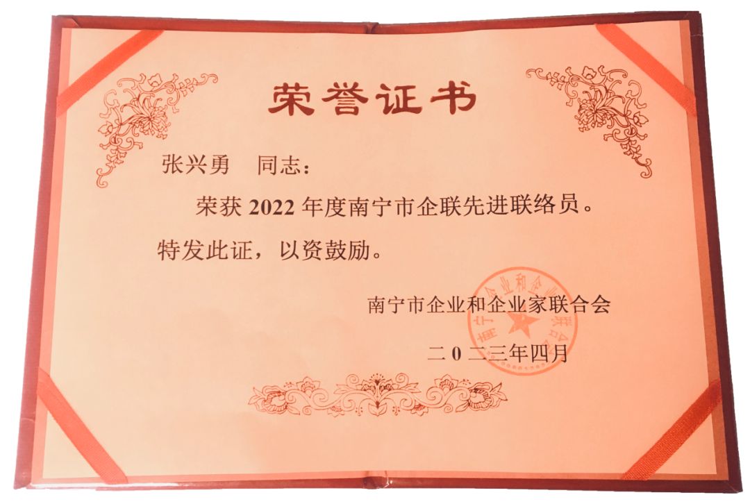 人才兴企,实干强企。近日,2022 年度市企联工作积极分子、先进联络员、优秀通讯员总结表彰暨经验交流会在北部湾航运中心大楼召开,广西天缘绿科技集团企划总监张兴勇被评为2022年度先进联络员!