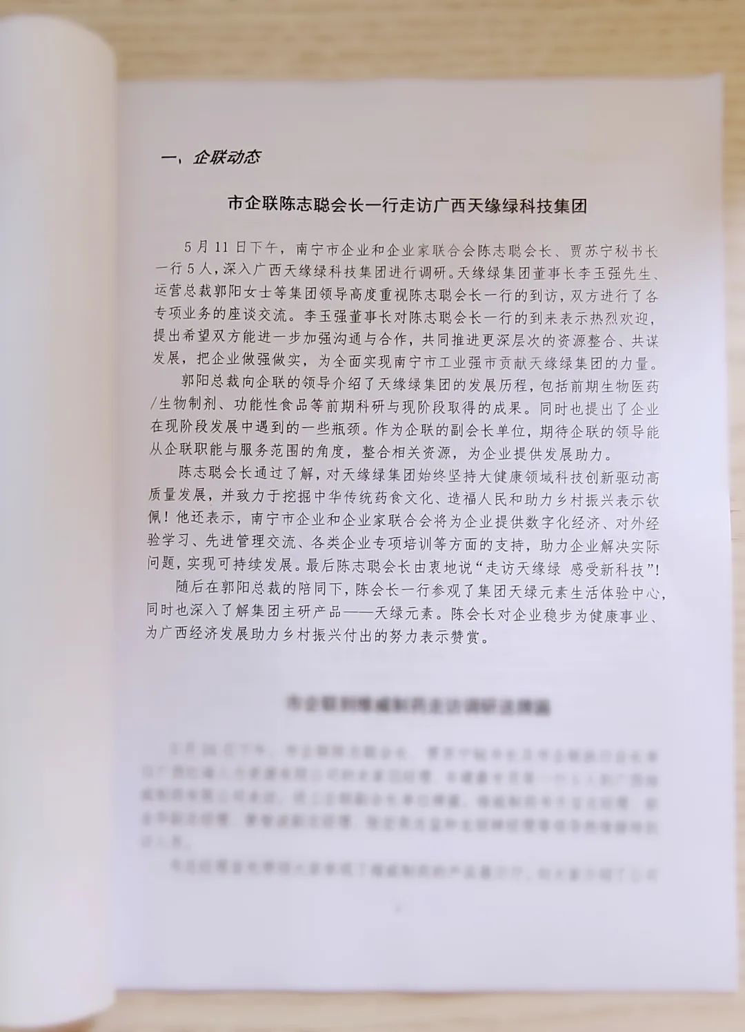 南宁市企业和企业家联合会致力于为会员单位提供优质的服务和支持,对副会长单位广西天缘绿科技集团的发展一直保持高度关注。5月底,南宁市企联同期组织了对天缘绿集团的走访考察活动。并在其5月会员内刊中对以上活动进行了详细报道,向广大会员企业介绍了天缘绿集团的发展历程、产品特色、社会贡献等方面的信息,以期激励更多的企业学习其先进经验,共同推动南宁市大健康产业的发展。