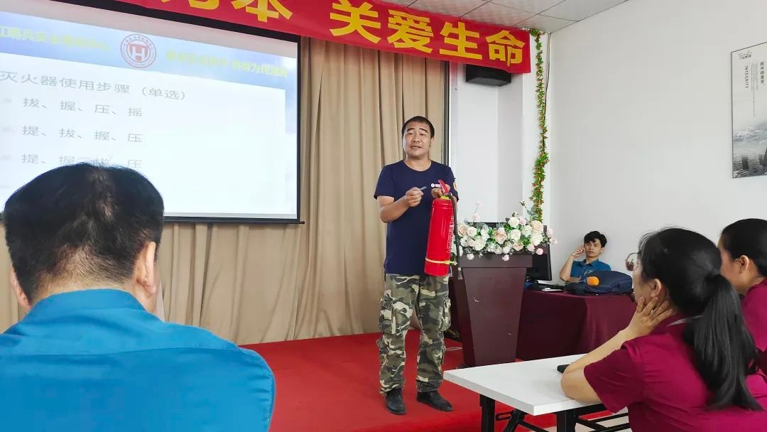 为了使员工们更好地掌握应急处置技能,曾教官在讲座现场进行了实用的演示。他生动展示了正确使用灭火器的方法,以及在面临坍塌风险、油锅着火等常见场景时的应急处置技巧。更重要的是,他积极邀请员工们参与互动,细致考核取灭火器的时间、应拿几个灭火器以及如何检查灭火器是否能够正常使用等小细节。通过实际操作灭火器,员工们亲身体验并掌握了正确的灭火方法,同时也对需要注意的细节有了更深刻的理解。这样的互动环节不仅加强了员工们的参与度,也进一步提升了他们在应急情况下的应对能力和技巧。