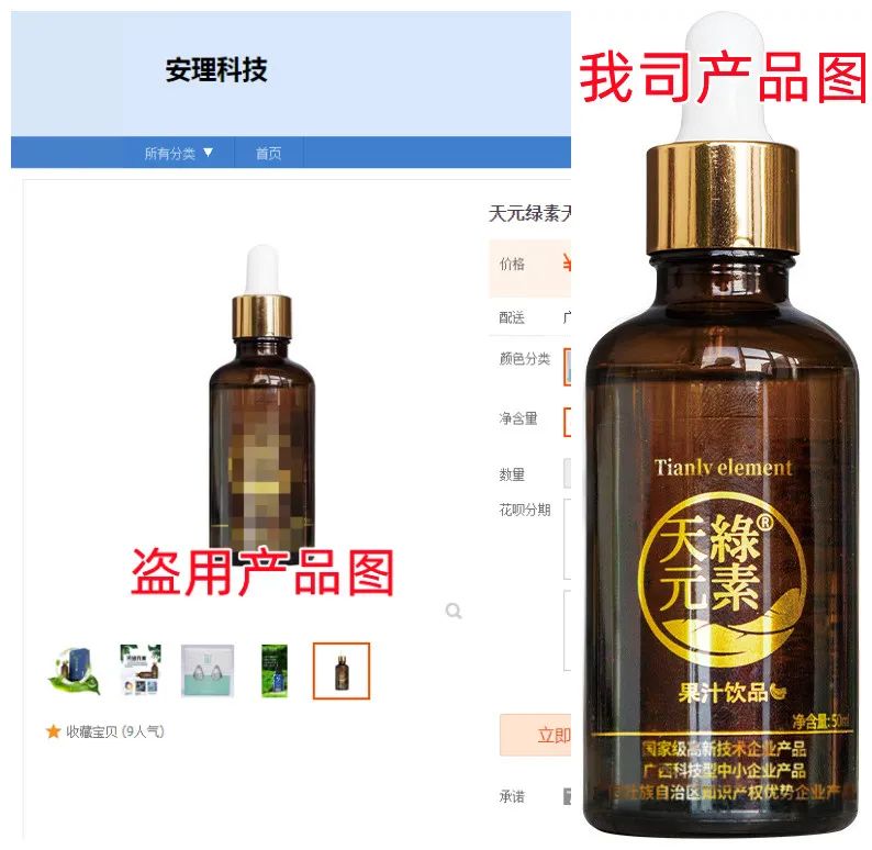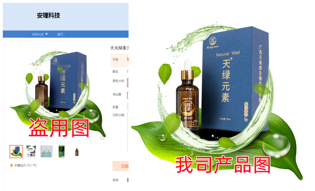 随着品牌不断发展壮大、知名度日益提升,我公司生产的天绿元素及系列产品受到社会各界的广泛关注。近日,我司发现淘宝卖家“安理科技”在其店铺中恶意盗用我司【天绿元素】产品宣传图和海报,用来误导消费者购买他们的产品。