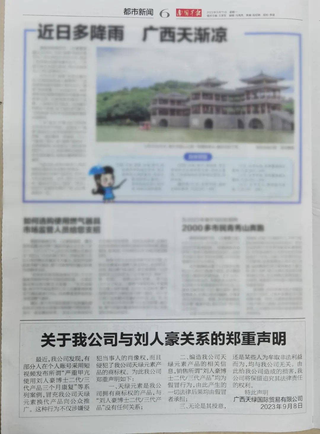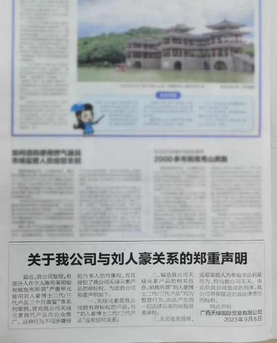 近日接到用户反馈,发现有人在网络编造发布我司相关信息,假冒我司产品,推销所谓“刘人豪博士二代/三代产品”。对此行为,天缘绿集团子公司--广西天绿国际贸易有限公司已在【南国早报】刊登了郑重声明。敬请消费者甄别购买,谨防上当受骗!