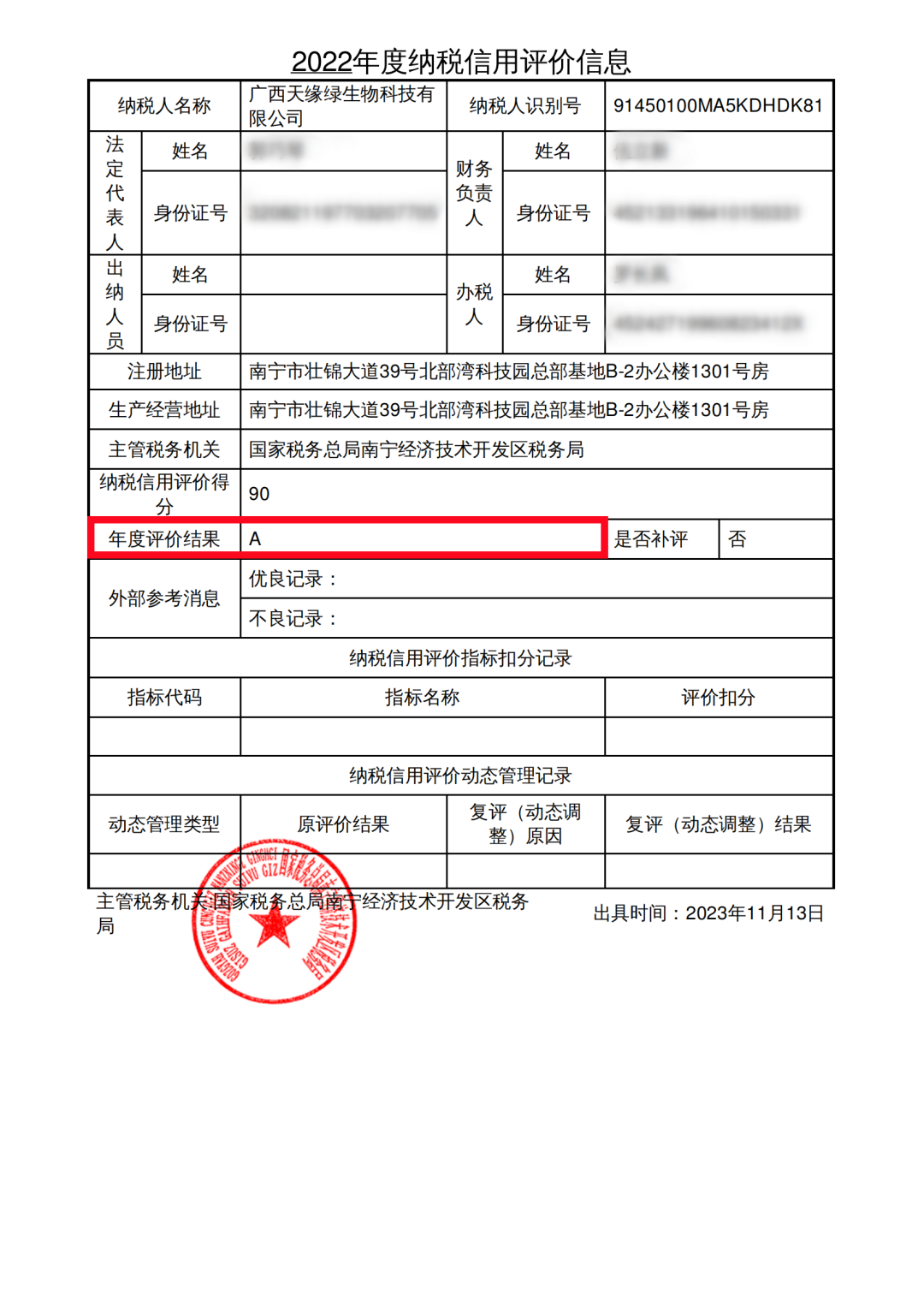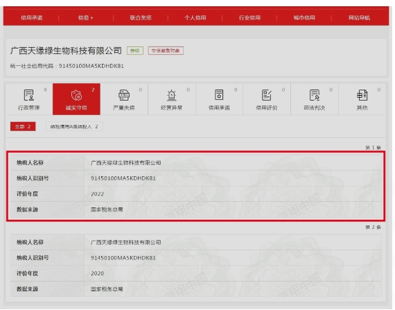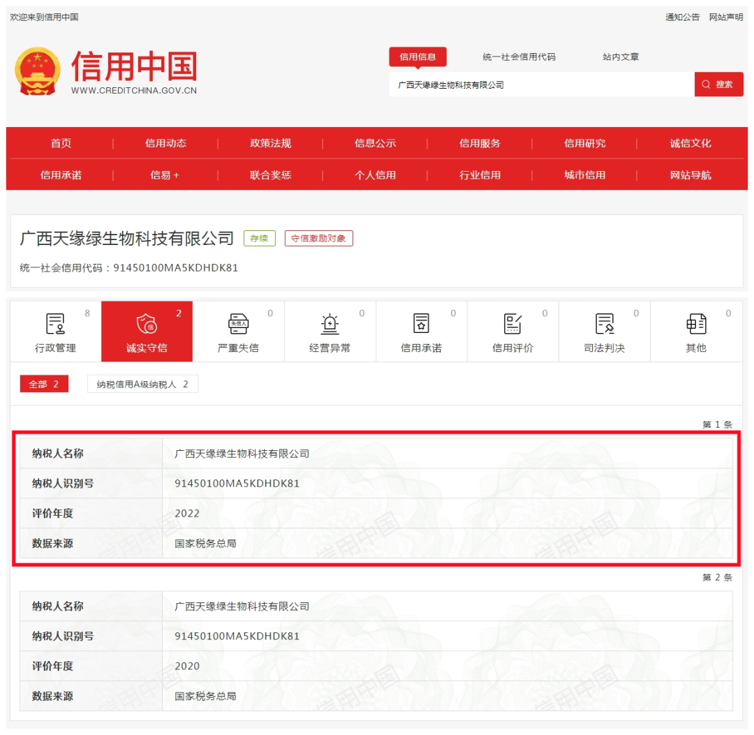 喜报!广西天缘绿科技集团母公司获评2022年度纳税信用A级纳税人