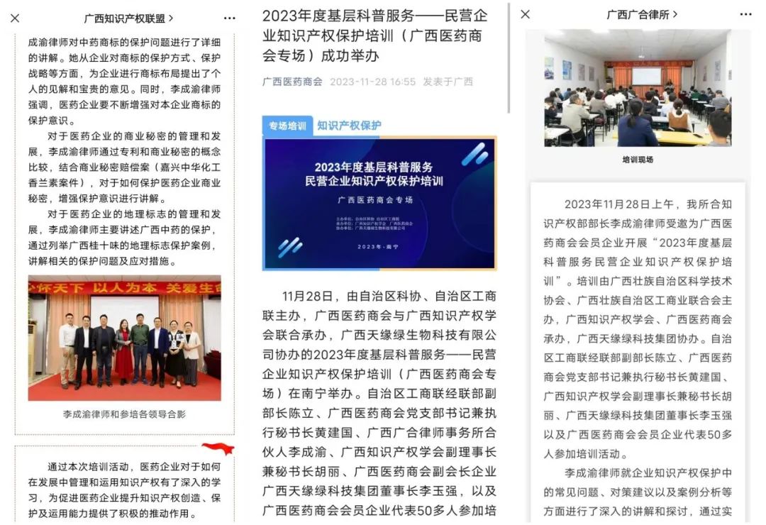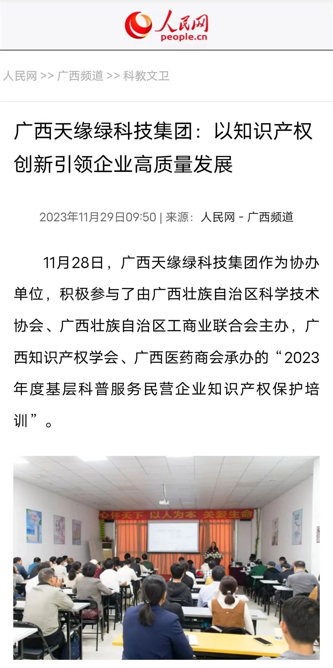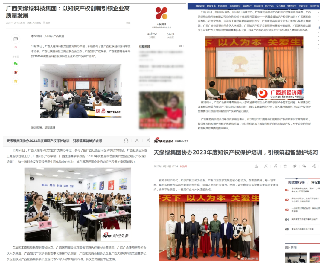正因如此,这场培训会议受到了人民网的高度关注,并刊登了标题为《广西天缘绿科技集团:以知识产权创新引领企业高质量发展》的报道。报道发布后,新浪新闻、网易新闻、搜狐以及广西新经济网等多家知名媒体纷纷进行了转载,使得此次培训会议的影响得以进一步扩大,引发了社会对知识产权保护工作的广泛关注和热烈讨论。