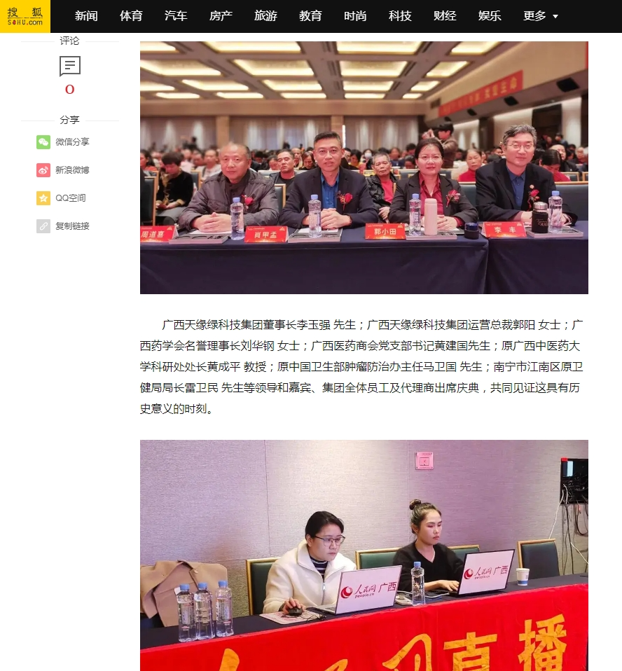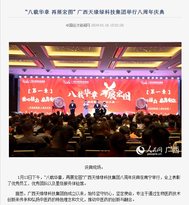 随后,中国日报网、搜狐网、网易新闻、华声晨报、八桂网、中国经济新闻网等众多主流媒体纷纷转载报道天缘绿集团的八周年庆典。各大媒体的转载和发布不仅让更多人了解了天缘绿集团,还引发了全社会对中医药发展、药食同源文化、传统中医药与现代生物科技融合等方面的关注和思考。