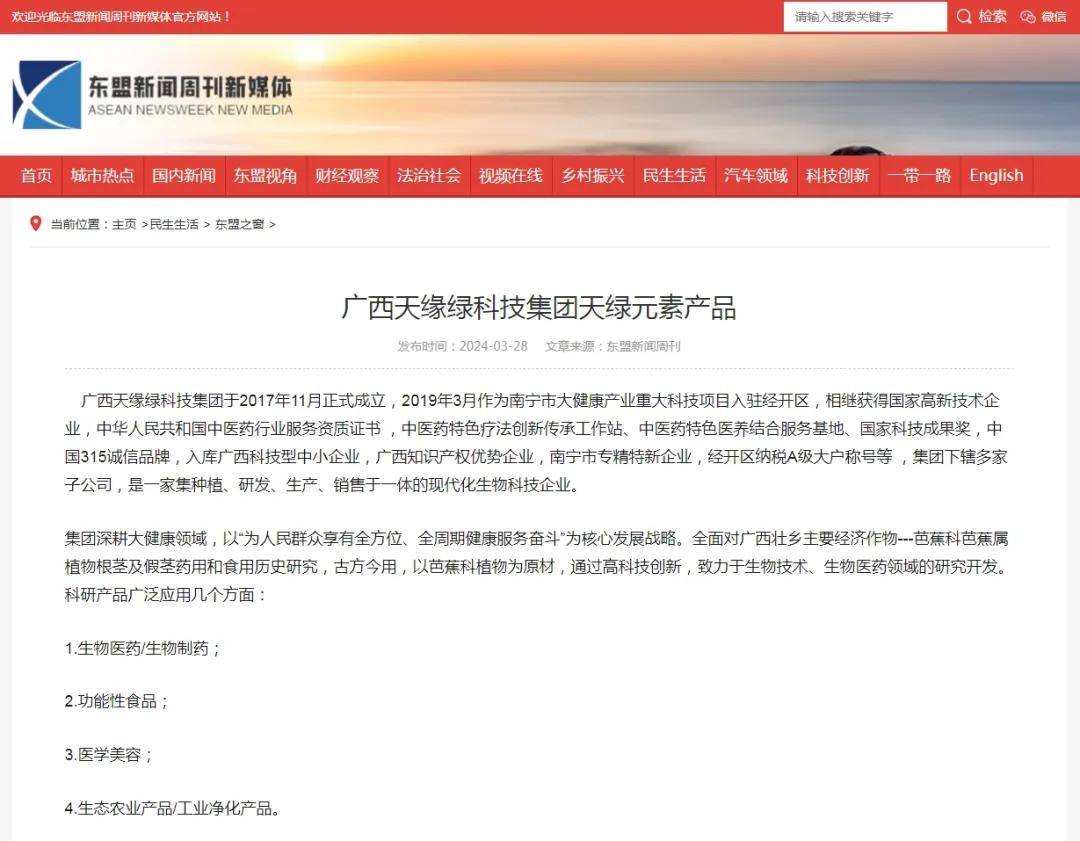 其中,东盟新闻周刊更是在其官方网站《东盟之窗》版块上,对天缘绿集团的天绿元素系列产品进行了重点展示与强烈推荐,这无疑是对天缘绿集团深耕大健康领域、不懈追求的最好认可和背书。