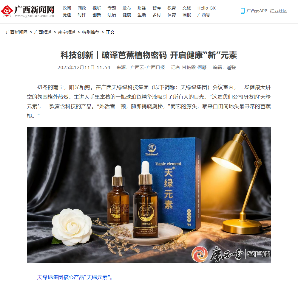 近日,广西权威媒体“广西云-广西日报”以《破译芭蕉植物密码 开启健康“新”元素》为题,对广西天缘绿科技集团进行深度报道,全景式展现了寻常芭蕉根,如何通过科技创新蜕变为守护健康的“天绿元素”全过程。这不仅是对天缘绿科研实力的认可,更是对我们所践行的“科技惠农”产业模式的生动诠释。