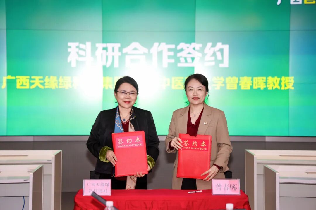 ▲ 广西天缘绿科技集团与广西中医药大学曾春晖教授进行科研合作签约