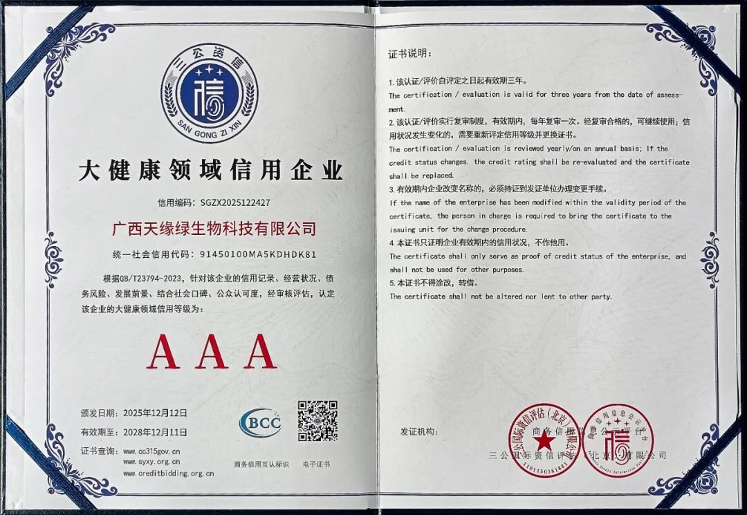 它意味着,在专业而客观的评判体系里,天缘绿作为一家深耕大健康领域的企业,其“健康他人、成就自己”的实践,得到了社会信用体系的背书与认可。这份认证,是我们递给每一位合作伙伴、每一位用户最诚挚、最可靠的一张“信用名片”。