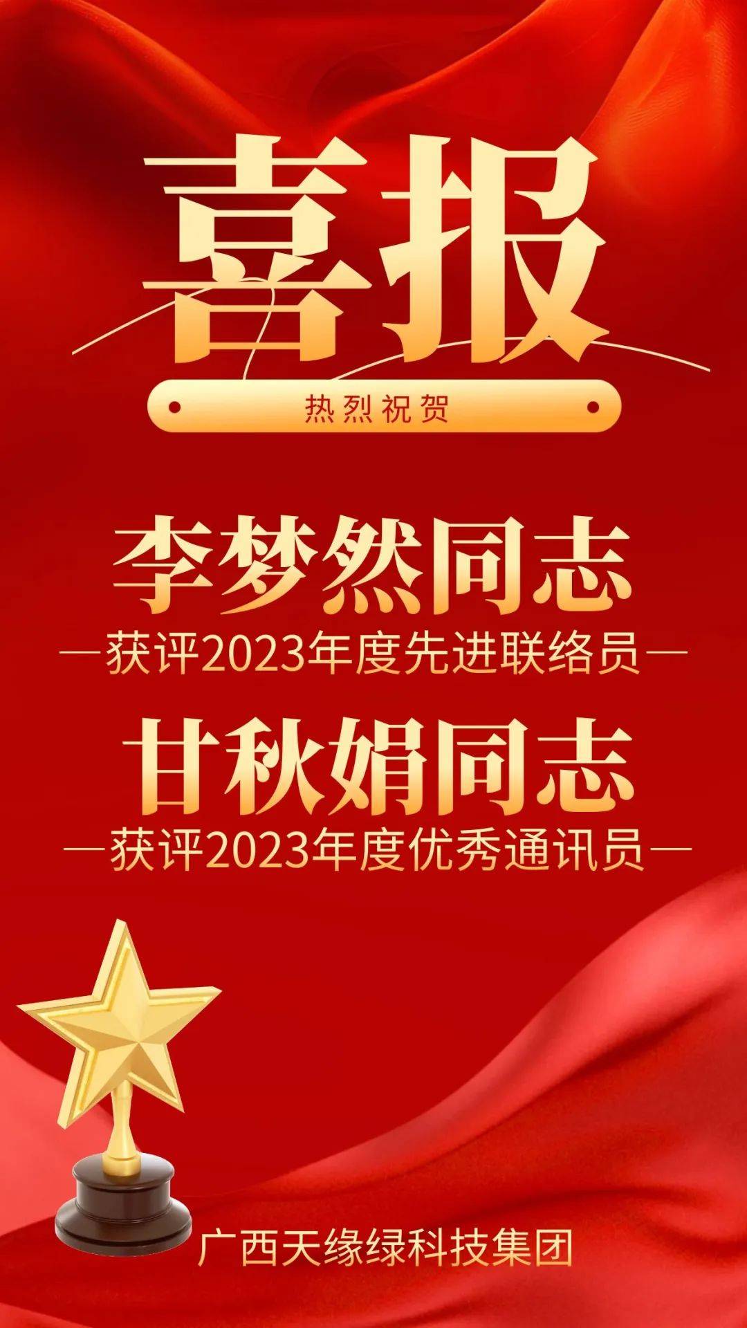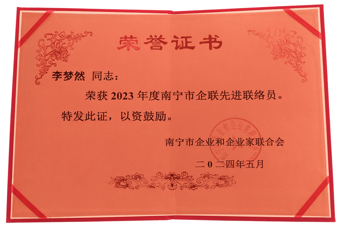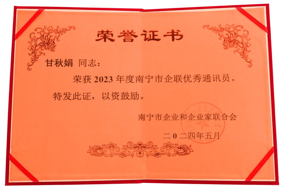 五月,是大地回春、万物生长的时节,更是我们向辛勤劳动者致敬、颂扬其付出的月份。在这个充满敬意与赞美的季节里,广西天缘绿科技集团市场部李梦然同志、企划部甘秋娟同志以卓越的工作表现,分别荣获了南宁市企联2023年度“先进联络员”和“优秀通讯员”的荣誉称号。