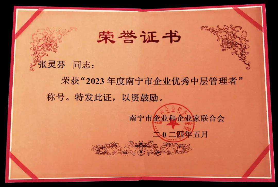 多年来,广西天缘绿科技集团凭借其卓越的技术实力和市场表现,赢得了业界的广泛认可,陆续获得国家高新技术企业、广西知识产权优势企业、南宁市专精特新企业、经开区纳税A级大户等荣誉。同时,集团一直高度重视中层管理者的培养和发展,通过建立完善的培训机制和激励机制,为中层管理者提供了广阔的成长空间和职业发展平台。此次荣获“2023年度南宁市企业优秀中层管理者”荣誉称号,不仅是对中层管理者个人能力的认可,更是对集团整体管理水平的高度肯定。