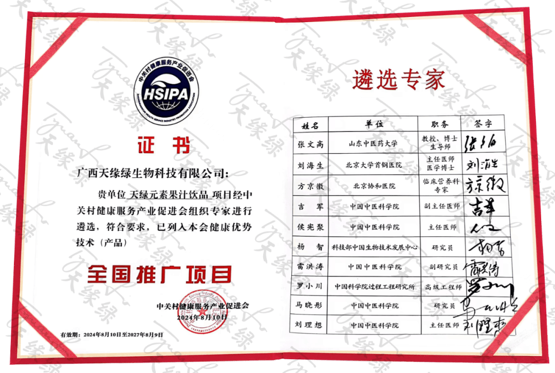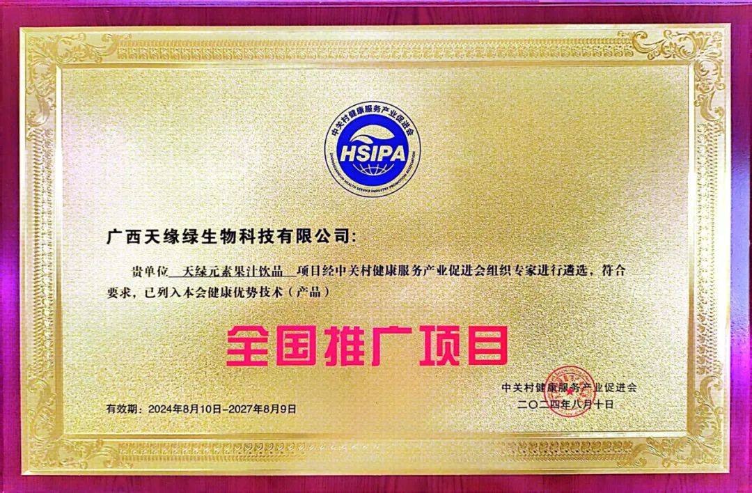 中关村健康服务产业促进会,致力于推动我国健康产业迈向高质量发展新阶段,其推广项目不仅遵循行业高标准,还紧密跟踪健康科技前沿动态。天绿元素的成功入选,不仅是对产品品质的肯定,更是对天缘绿集团在科研创新与市场潜力方面的高度认可。这一荣誉将激励天缘绿集团继续深耕健康领域,推动技术创新与产业升级,为人类的健康福祉作出更大贡献。