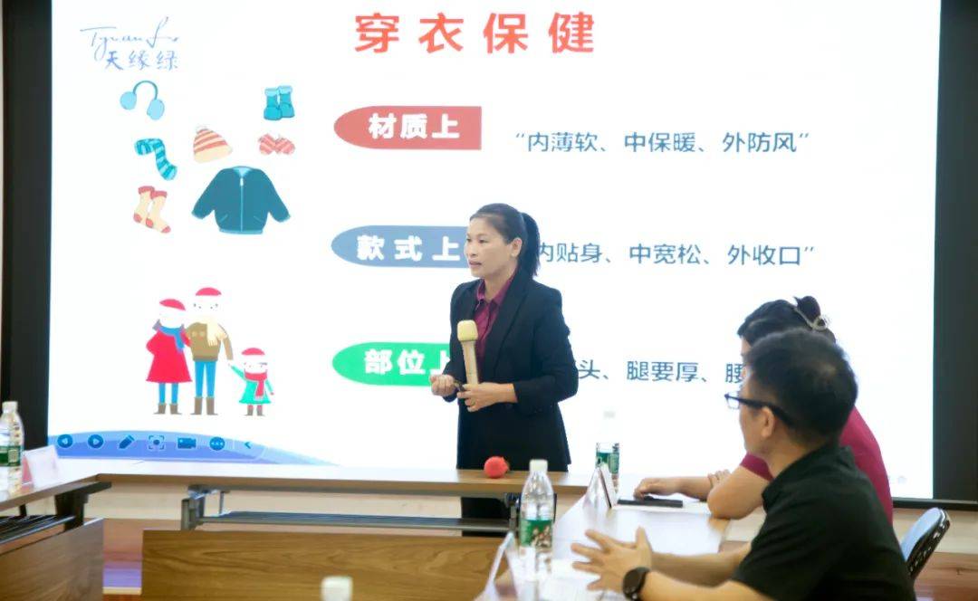 随后,国家高级健康管理师黄秀森老师作为主讲嘉宾,为大家带来了一场精彩的冬季保健知识讲座。黄老师凭借丰富的专业知识和实践经验,深入浅出地讲解了冬季常见疾病的种类及预防措施。她特别强调了穿衣、饮食、起居、运动四个方面在冬季保健中的重要性,并穿插分享了诸多实用的小技巧,如怎么选择合适的保暖衣物、冬季男女养肾喝两汤以及冬季泡脚的注意事项等,这些实用的知识技巧让在场的听众受益匪浅。
