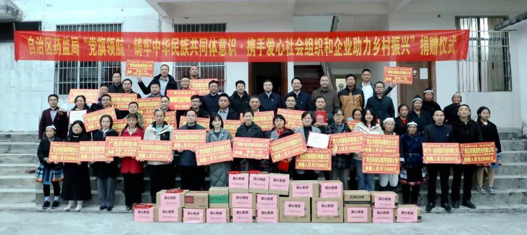 天缘绿集团与广西医药商会、广西药师协会、广西医疗器械行业协会、广西化妆品协会等众多单位跟随广西壮族自治区药监局领导携手共赴南丹县,开展了以“党旗领航·铸牢中华民族共同体意识·携手爱心社会组织和企业助力乡村振兴”为主题的帮扶捐赠活动。