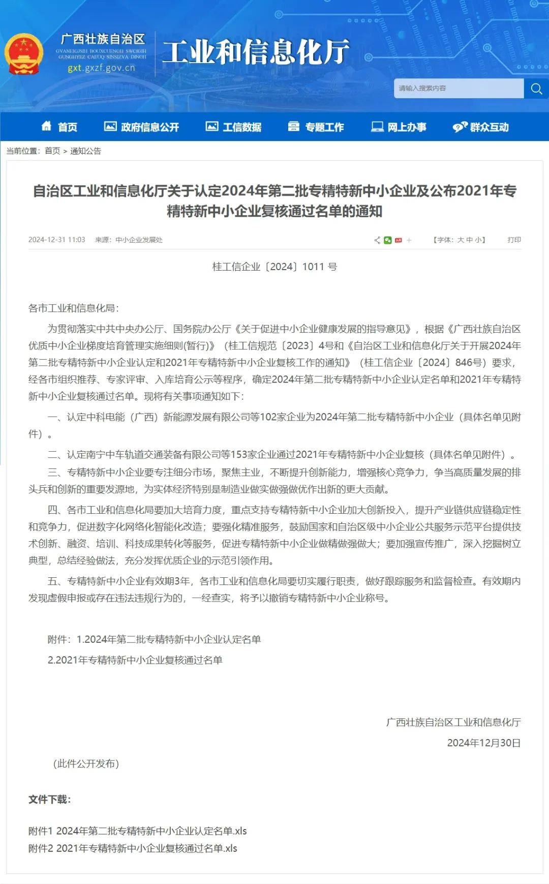 近日,广西壮族自治区工业和信息化厅在其官方网站公布了2024年第二批专精特新中小企业名单,江南全站凭借卓越的创新实力,成功荣获广西“专精特新”中小企业称号。这是继公司荣获南宁市“专精特新”中小企业称号后,再次获得的自治区级荣誉。