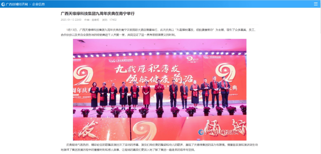 庆典盛况空前,南国早报、听闻广西、东盟新闻周刊、中国报道、东盟头条、掌上时报、广西县域经济网等三十多家新闻媒体纷纷聚焦此次庆典,竞相报道这一健康产业的盛事。媒体记者们用镜头捕捉每一个精彩瞬间,用笔触记录每一份感动与荣耀,将天缘绿集团九周年的辉煌与梦想传递给千家万户。