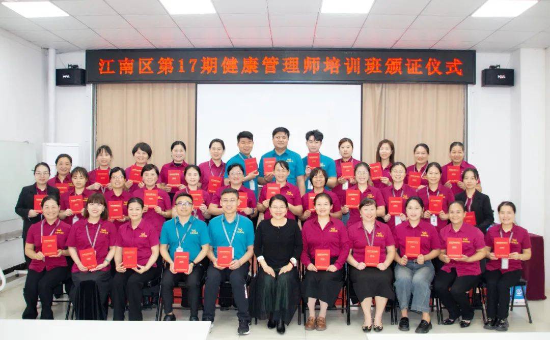 3月3日,江南区第17期健康管理师培训班颁证仪式在天绿元素生活体验中心温馨举行。42名学员参加考试,40人成功取得国家高级健康管理师证书,通过率高达95%。这场仪式不仅是对学员们努力的肯定,更是天缘绿集团在人才培养和践行社会责任上的又一次见证。